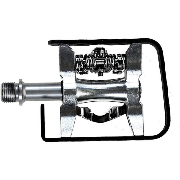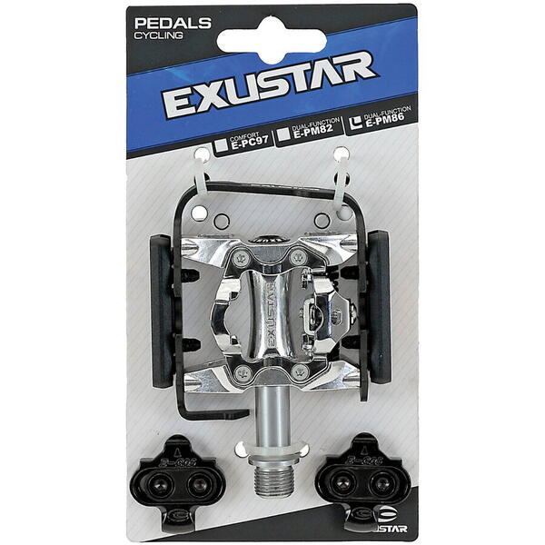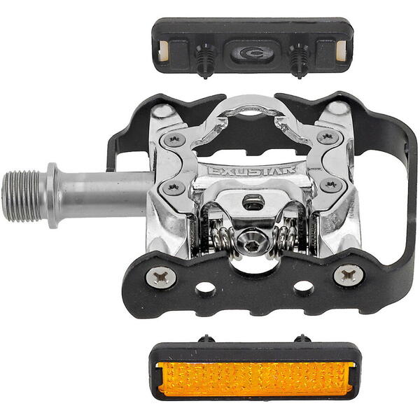 • Pedalele pot fi folosite pe ambele parti si puteti decide acum daca doriti sa calariti cu pantofi click sau pantofi normali in viata de zi cu zi, prin care suprafata benzii de rulare de 66 x 83 mm ofera un sprijin suficient. Pentru a asigura o intrare usoara, placutele de pantofi, care sunt compatibile si cu pedalele Shimano, sunt incluse in pachet. Astfel, sunteti bine pregatiti pentru tururi sportive, prin care compatibilitatea este valabila si in cazul in care sunt deja disponibile cleme Shimano. In acelasi timp, corpul din aluminiu garanteaza o durabilitate lunga, precum si o stabilitate ridicata, ceea ce este confirmat si de testul ISO 4210 trecut. Desigur, pedalele corespund calitatii Exustar dovedite si, prin urmare, sunt deosebit de durabile si ruleaza usor, deoarece sunt echipate cu rulmenti cu bile industriale japoneze sigilate, iar axul CrMo prelucrat CNC argintiu contribuie, de asemenea, la acest lucru.